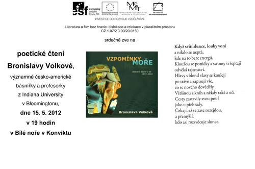 „Vzpomínky moře“, autorské čtení Bronislavy Volkové, česko-americké básnířky a profesorky z Indiana University v Bloomingtonu